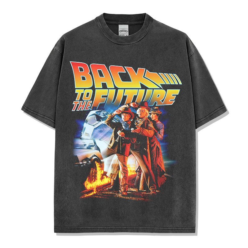 חולצת אופנת רחוב עם הדפס גרפי של Back to the Future – בחזרה לעתיד. שילוב מושלם של קולנוע אייקוני, נוסטלגיה וסטייל אורבני.