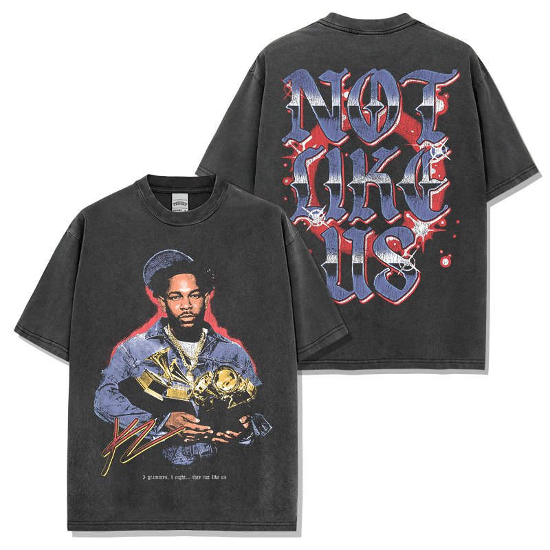בגב החולצה מתנוסס הכיתוב הבולט NOT LIKE US, מסר חד וברור שמסמל את הסגנון הייחודי שמזוהה עם קנדריק.